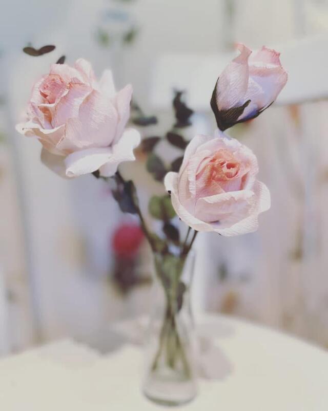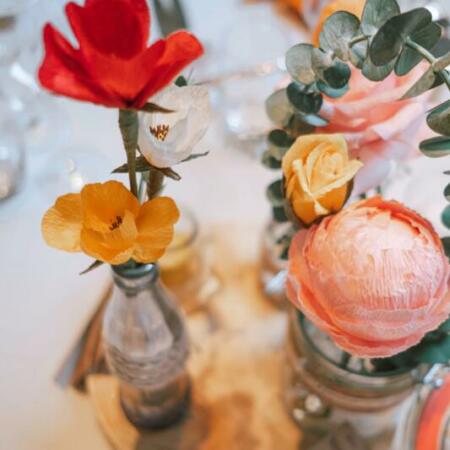 La couronne florale, les guirlandes de fleurs, les murs garnis de roses pour un fond photo, ou encore une fleur extravagante sur tige pour un photobooth décalé… Avec ces fleurs de papier, il n’y a plus de limite décorative, il est donc possible d’habiller et fleurir tout à fait différemment un lieu et ses murs.