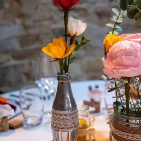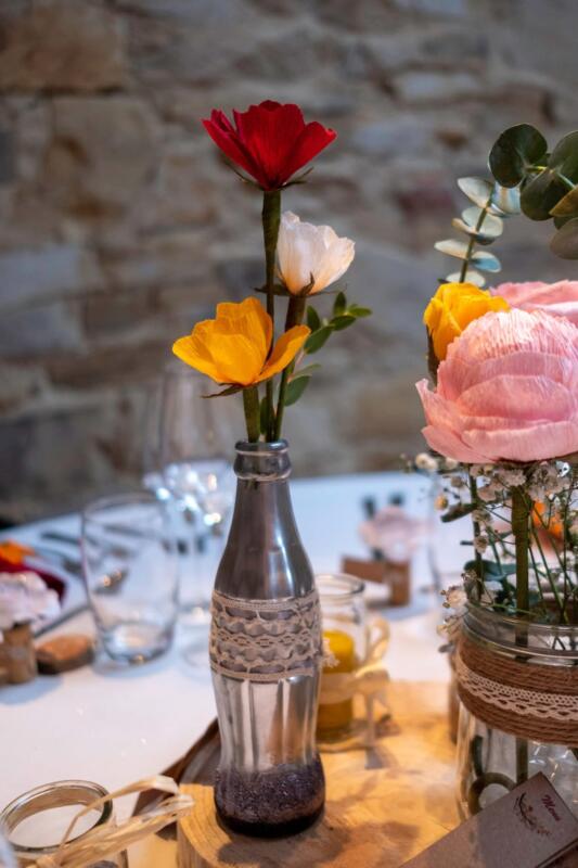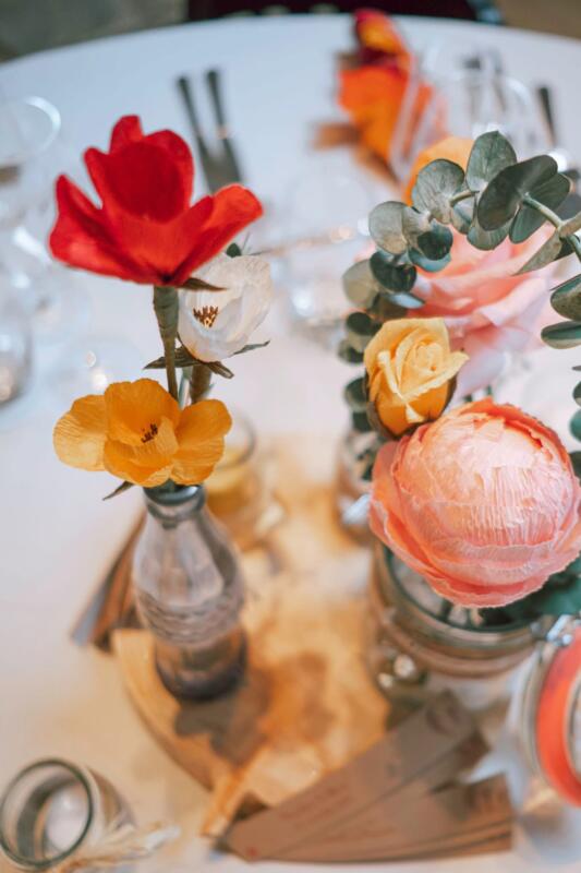 Grâce à ses créations ultra visuelles, Fleur Papier Ciseaux vous propose des décors et scénographies qu’il ne serait pas permis d’imaginer sans des fleurs de papier : pour renforcer l’atmosphère romantique d’une cérémonie laïque avec une arche fleurie de fleurs volumineuses, pour apporter de la féérie au cocktail avec des coquelicots géants, en suspendant des guirlandes fleuries aux branches des arbres pour un esprit champêtre, en apportant un décor dégagé à la piste de danse avec des couronnes fleuries de différentes tailles ou encore en sublimant le moment du repas grâce à un ciel garni de fleurs …