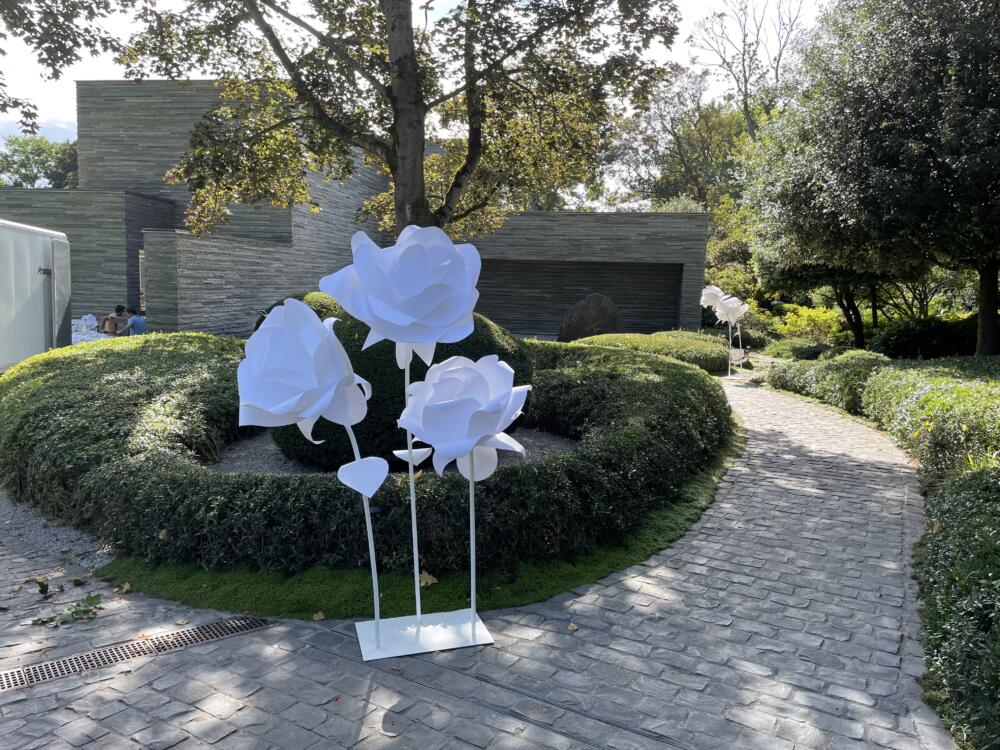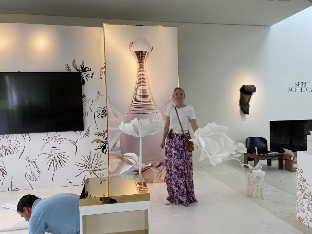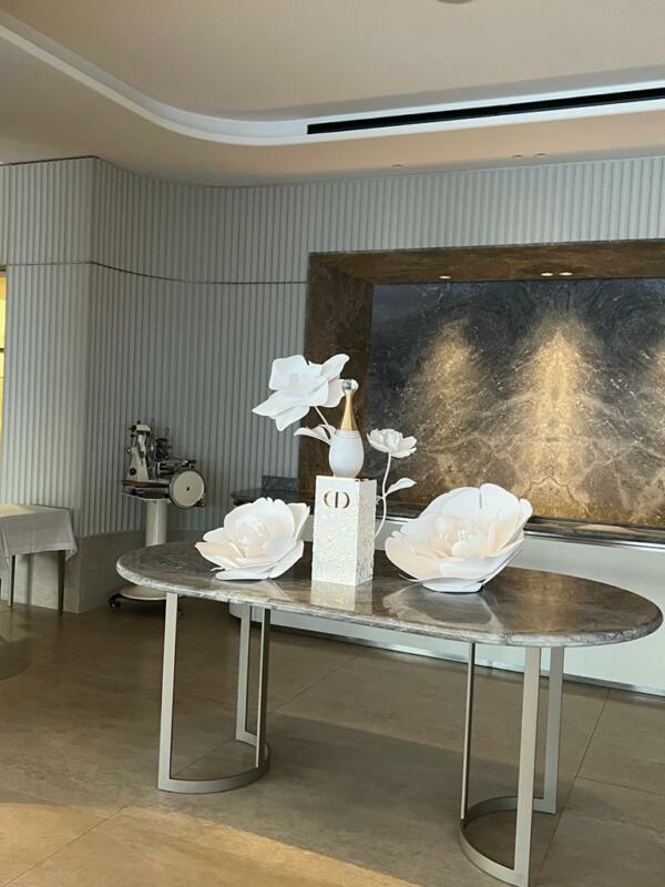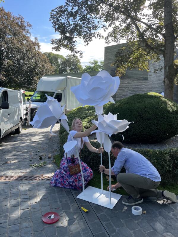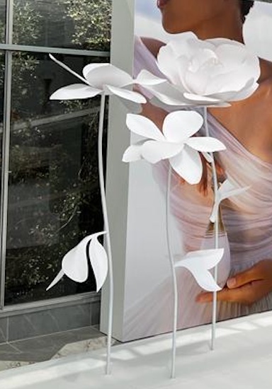 A l'occasion du lancement en Belgique du nouveau parfum "J'ADORE - L'Eau de Dior", Création de la scénographie avec des fleurs géantes blanches sculpturales et contemporaines.